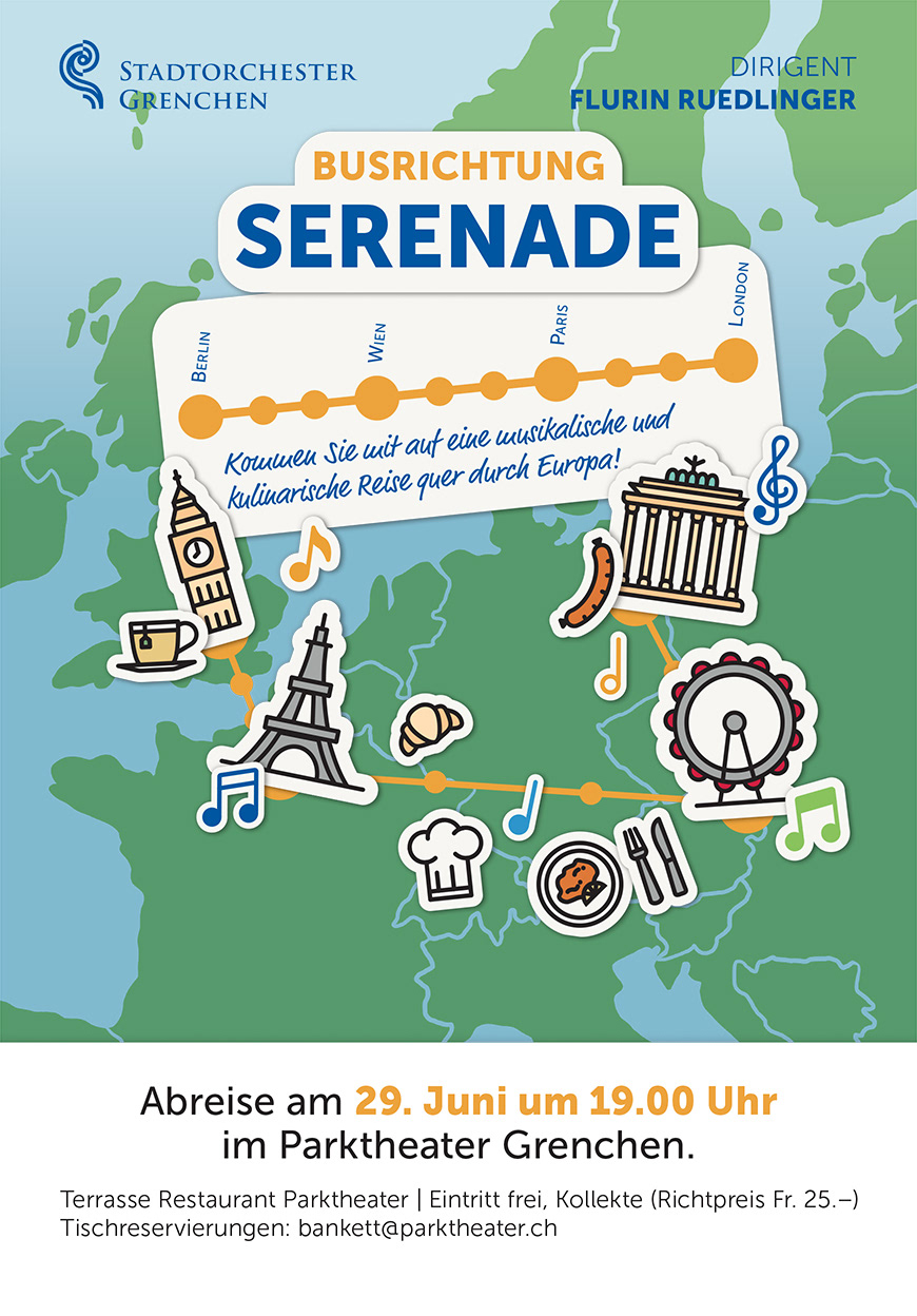 The orchestra in Grenchen puts on different themed serenades throughout the year. They commissioned me to design a flyer for their Europe-themed concert. They wanted me to incorporate elements of bus tour plans with iconic landmarks as stops.